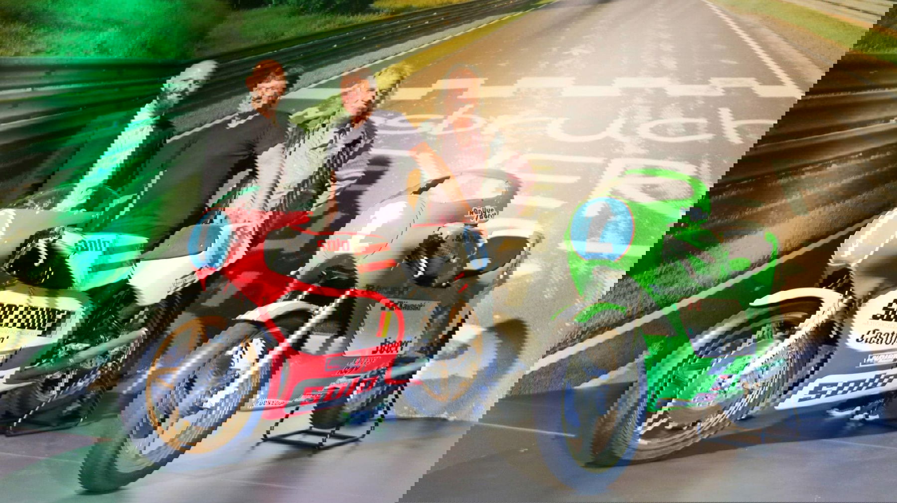 Ausgestellt sind unter anderem die Motorräder von Toni Mang (Bild – grüne Kawasaki mit der Nummer 2) und Jon Ekerold. Direkt nebeneinander auf einem Podest, erzählen sie die Geschichte einer ganz besonderen Rivalität.