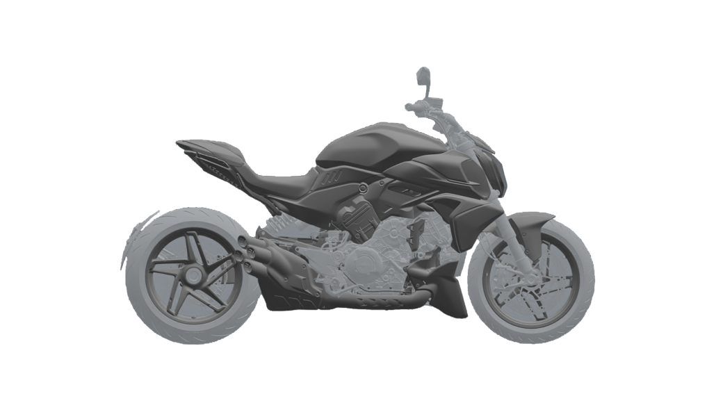 Auch die seitlichen Lufteinlässe wurden neu gestaltet. Sie entsprechen in ihrer Grundform jenen der Ducati Diavel V4 RS, bei denen die horizontale Strebe nun unterhalb der Mittelachse sitzt. Beim RS Modell sind diese Bauteile aus Carbon gefertigt und zweiteilig ausgeführt. Für die Standardversion der Diavel V4 ist hingegen davon auszugehen, dass Kunststoff zum Einsatz kommt. Unterschiedliche Farben oder Oberflächen sollen dennoch die Zweiteilung betonen und optische Akzente setzen.