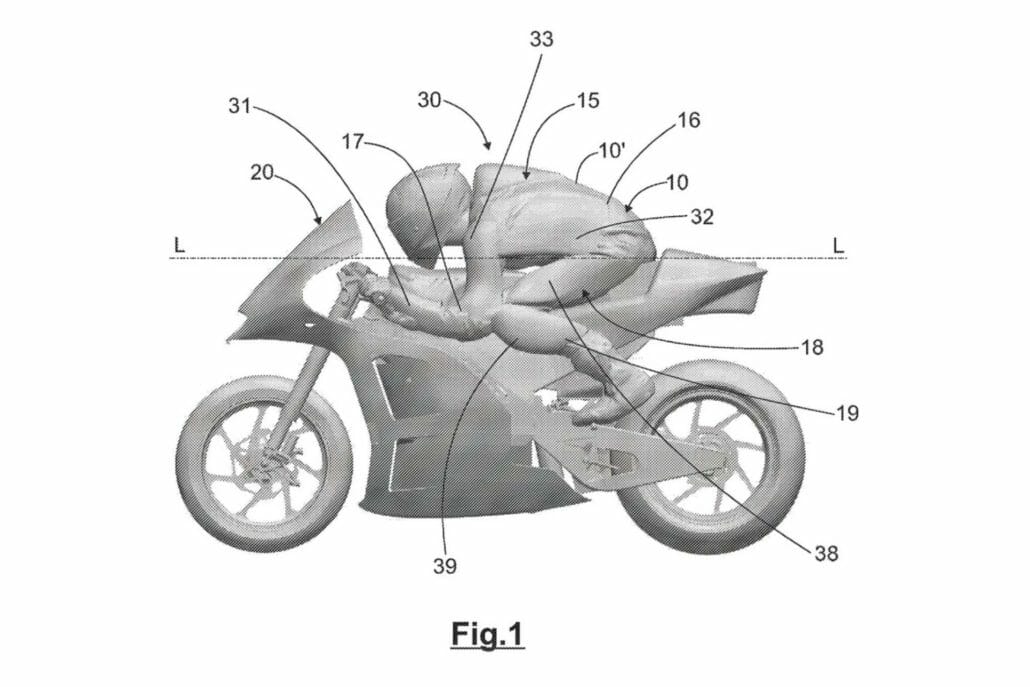Aprilia has filed a patent application that shows how racing combis can be improved aerodynamically. For decades, aerodynamic humps have been found on racing suits, originally developed as additional back protection and later proven to be aerodynamic aids as well. Apart from this and some further developments in the form of helmets, there has been little effort to optimize rider equipment aerodynamically.