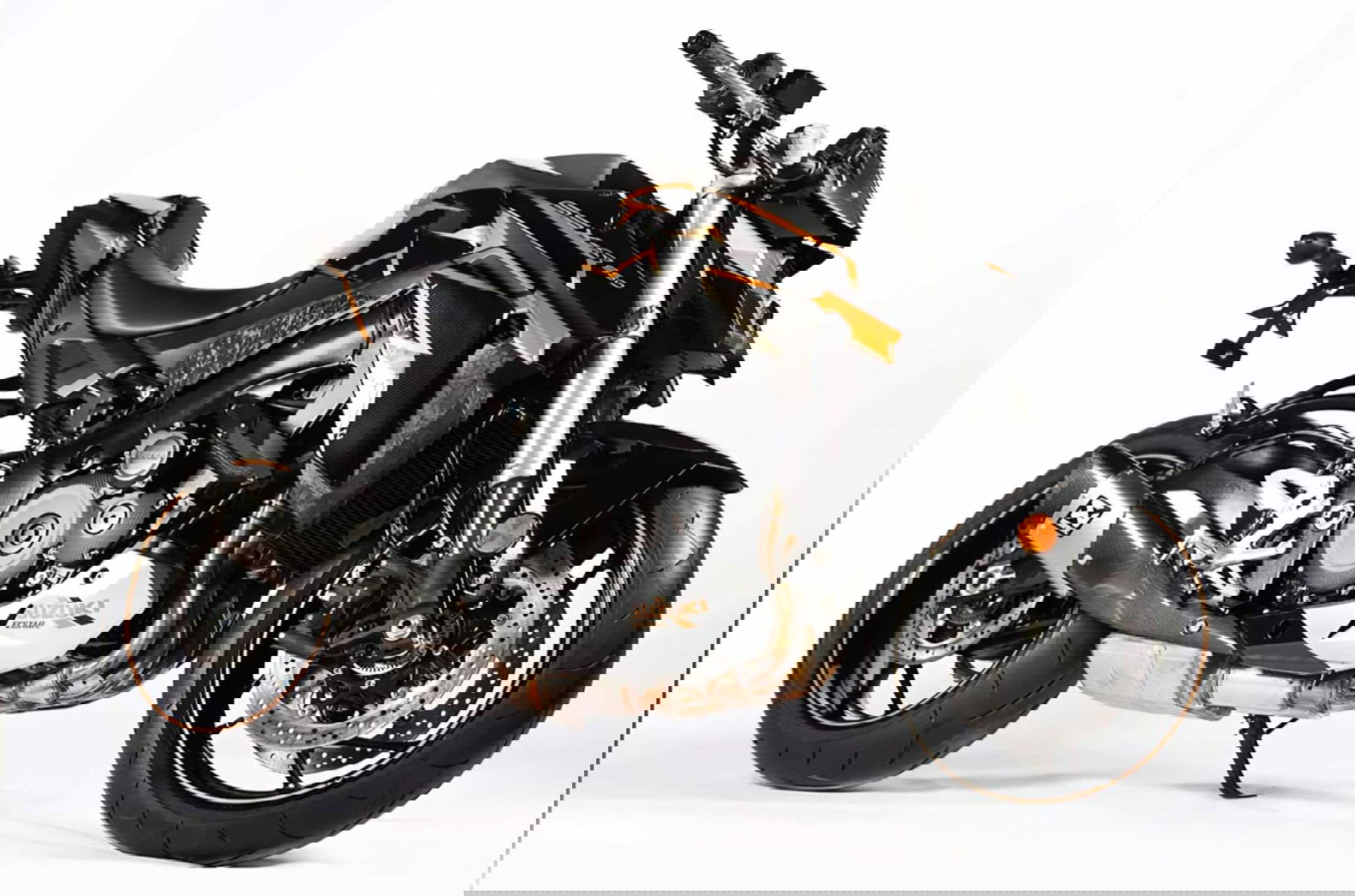 Many parts were taken from Suzuki’s accessories and parts catalog. The pillion seat was fitted with a fairing to achieve a single seat configuration. Composite plastic and carbon fiber fairing parts were installed. An Akrapovic slip-on muffler was also fitted. Visually, however, the biggest change is the special silver, black and gold paint scheme.