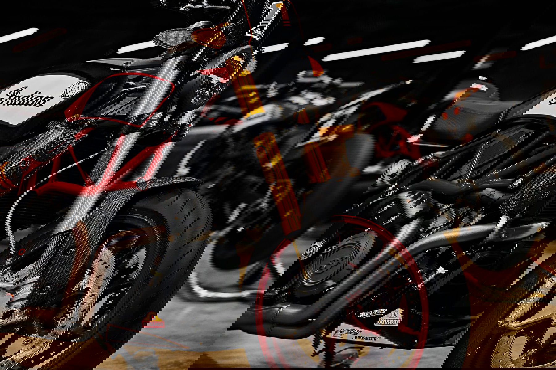 Das Design der FTR x RSD Super Hooligan verbindet die Ästhetik des Rennsports mit alltagstauglicher Funktionalität. Die Schwarzmetallic-Lackierung, ergänzt durch authentische Renngrafiken und den klassischen Indian Motorcycle Rot am Rahmen und den Rädern mit Goldakzenten, verleiht dem Bike ein unverkennbares Aussehen. Ergänzt wird dies durch das No. 1-Champion-Logo von Indian Motorcycle Racing und Logos der Rennsponsoren am Heck-Sitzkasten sowie weitere optionale Grafiken.