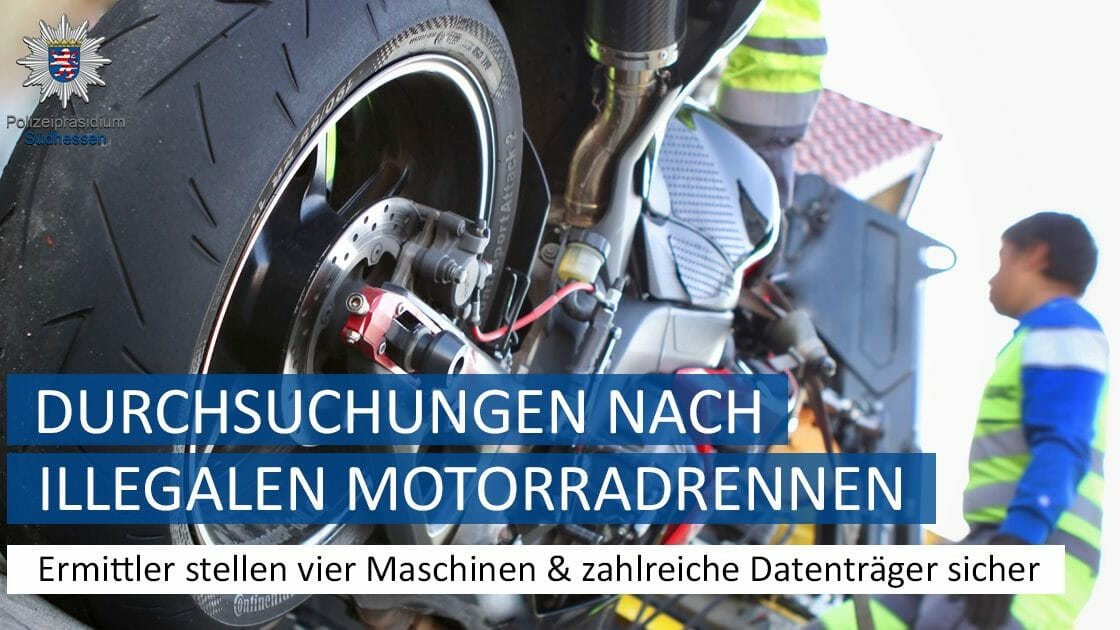 Heute, 11.09.2019, in den frühen Morgenstunden durchsuchte die Polizei sieben Objekte in Südhessen und Nordbaden. Hintergrund ist ein Verfahren wegen des Verdachts eines illegalen Straßenrennens. So verkündet es die Polizei Südhessen auf Facebook, mit einem Bild, dass offenbar eines der sichergestellten Motorräder zeigt.