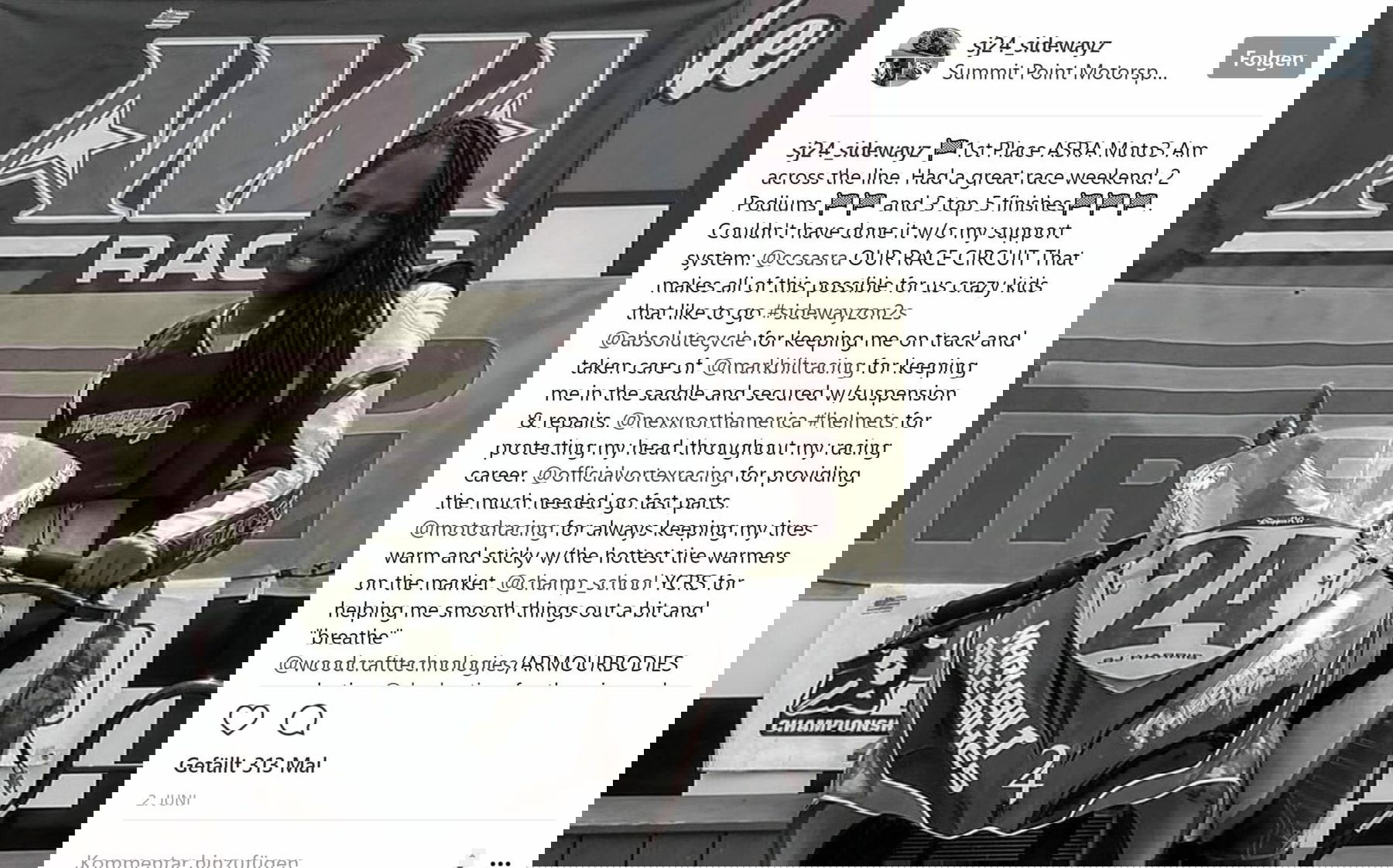 Sie fuhr eine Kawasaki Ninja 300 und eine Suzuki GSX-R 750. 2014 und 2015 nannte sie ihre Rookie-Saison, fuhr in der Middle Weight Supersport, Superstock und GTU. 2016 war für sie ihre Amateur Saison. Mini GP, SuperMoto, ASRA Endurance, Ultra-Light-Weight Superbike, Light Weight und GTL.