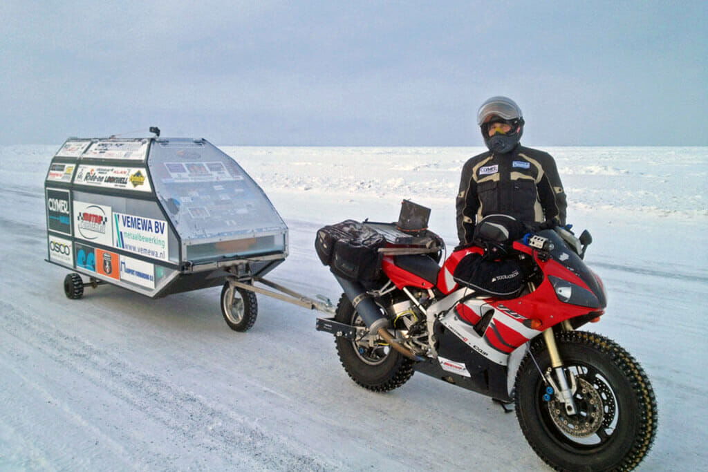 Der niederländische Motorrad-Abenteurer Sjaak Lucassen möchte mit einer modifizierten Yamaha YZF-R1 (BJ 2001) von Anchorage (Alaska) bis zum Nordpol fahren.