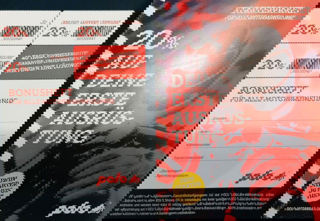 Fahrschüler bekommen bei Polo ein Starterheft mit Informationen über Vorschriften, Besonderheiten und allgemeinem Einsteigerwissen rund ums Motorrad. Mit dem Bonusheft spart man 20% auf die Erstausrüstung. Daneben gibt es ein Willkommensgeschenk im Wert von ca. 40 Euro.