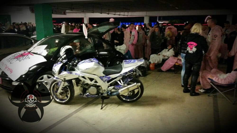 Man hört den bulligen Sound eines V2 oder das Kreischen einer Four, dreht sich um und sieht einen Motorradfahrer im rosa Hasenkostüm. Was ist da los?