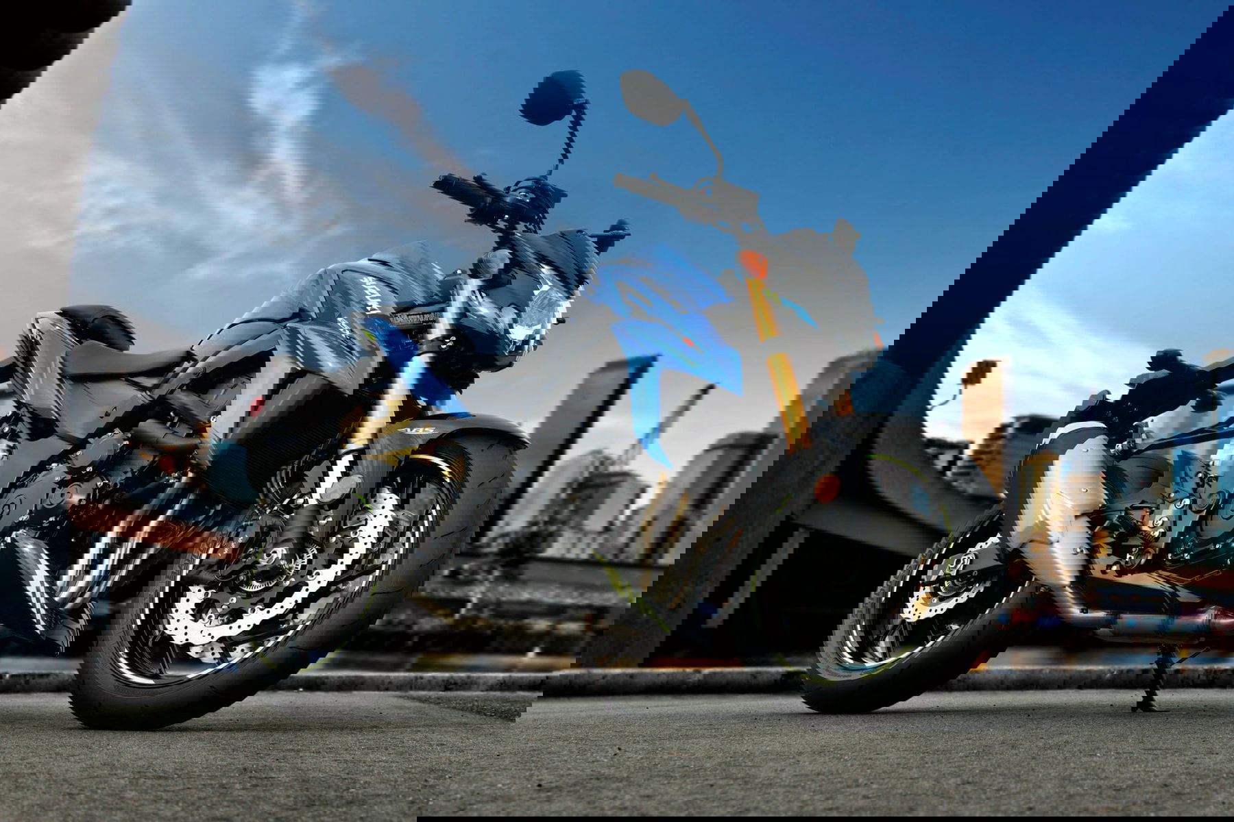 Es kommt für 2021 eine blau-schwarze Edition, die mit Neon-Applikationen ausgestattet ist. Tank, der vordere Kotflügel und Bugspoiler sind in schwarz gehalten. Kühlerverkleidung und der vordere Teil der Heckverkleidung kommen in Suzuki-blau. Neongelb sind die Felgenaufkleber, der Schriftzug am Heck sowie die Streifen am Bugspoiler.