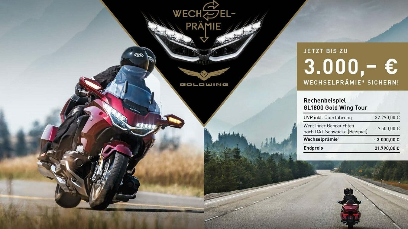 Ab sofort bietet Honda bei Kauf der Modellvarianten GL1800 Gold Wing Tour und GL1800 Gold Wing Tour mit DCT (Doppelkupplungsgetriebe) und Airbag, eine Wechselprämie von 3.000 € über Schwacke-Schätzwert, bei Inzahlungnahme eines Gebrauchtmotorrads.