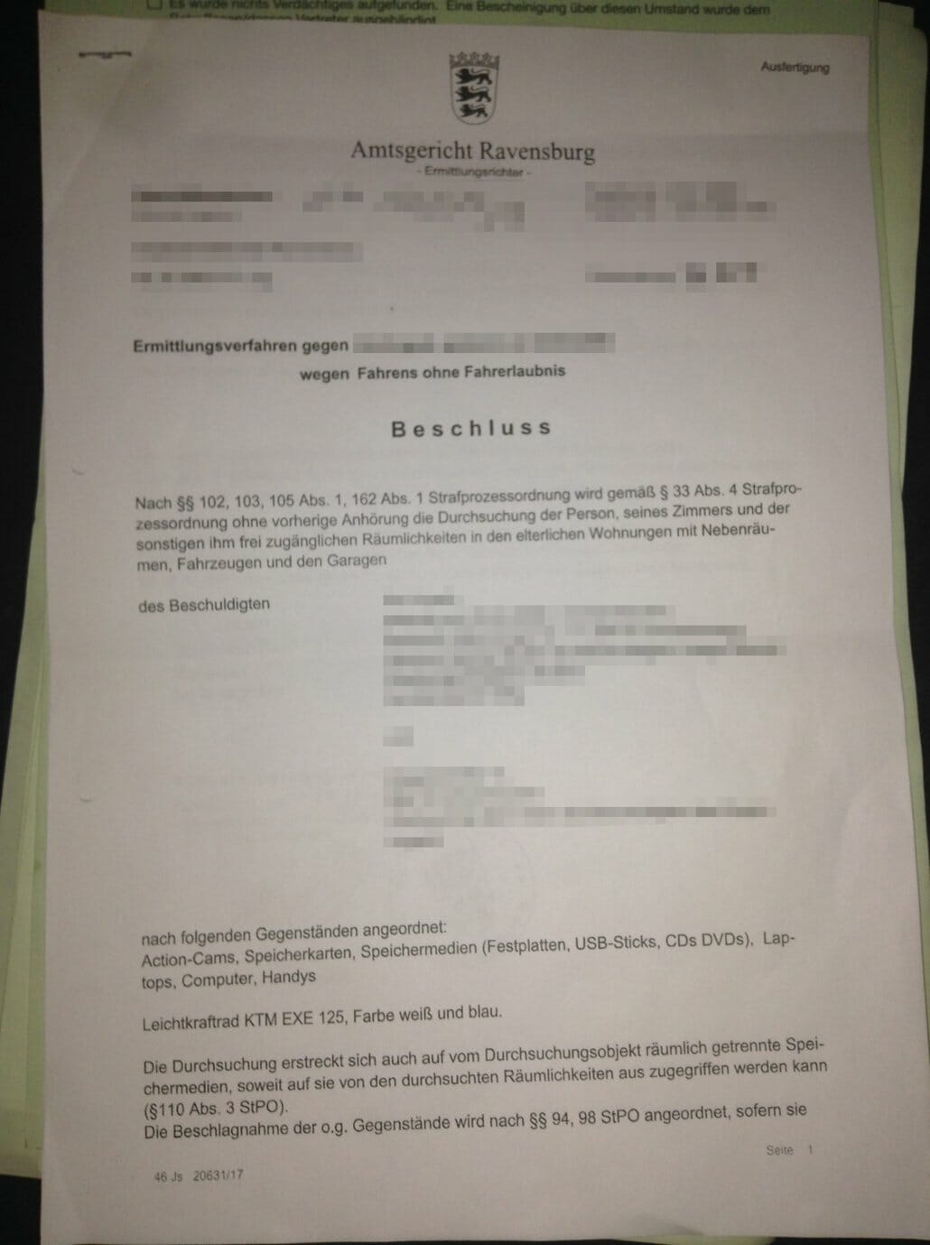 Die Polizei stieß aber auch auf die Aussage von Sumoduro, dass er seine KTM EXC 125 illegalerweise offen fährt. Das reichte für einen Durchsuchungsbefehl aus.